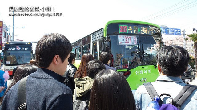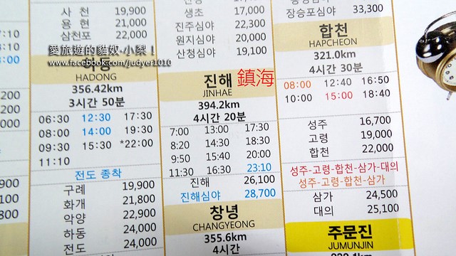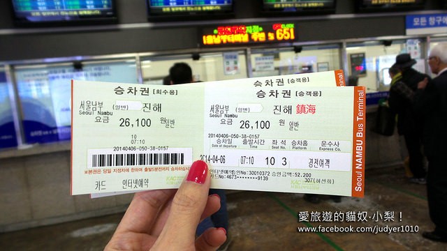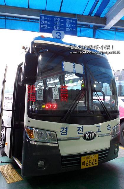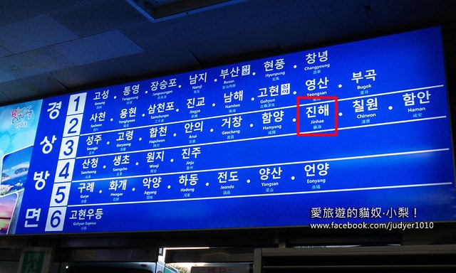 不會講韓語的朋友,就用寫的"진해"(鎮海)給售票員看,再註明人數及時間,或用比的都可以啦!再不然拍這張照片給她看~我當天是搭7:10的車,在3號處搭車~
