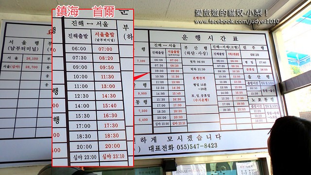 抵達之後,我們先去櫃臺買了明天回程的票(不會說的人一樣用寫的"서울"首爾),下方是時間表,給大家參考~