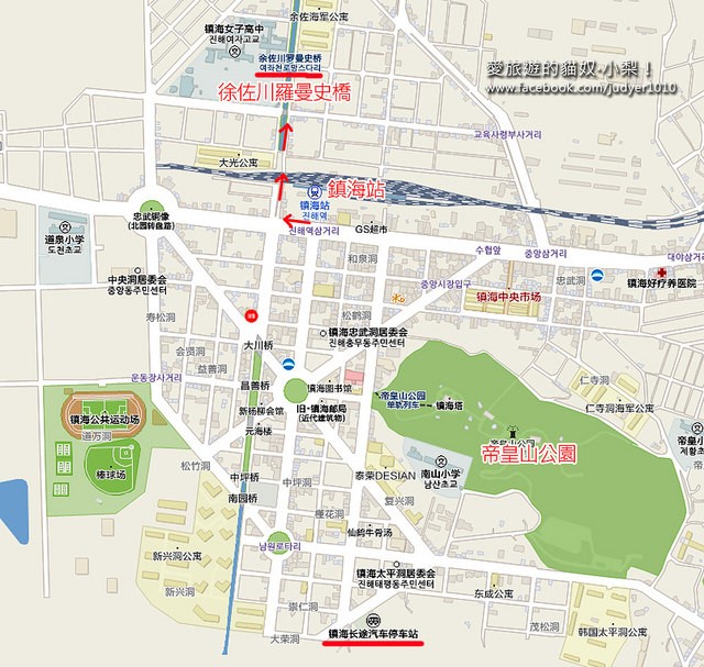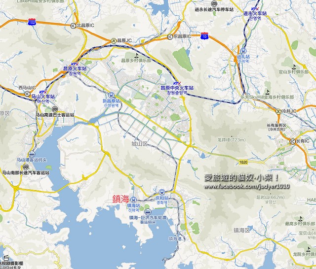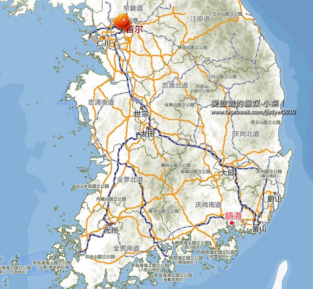 我們先來看看首爾跟鎮海的位置,如下圖標示,其實,鎮海離釜山很近,所以建議大家可以安排先去釜山玩,之後再去鎮海賞櫻~但由於當時我在首爾還有工作要去完成,所以才會撥了2天一夜,專程去一趟鎮海~