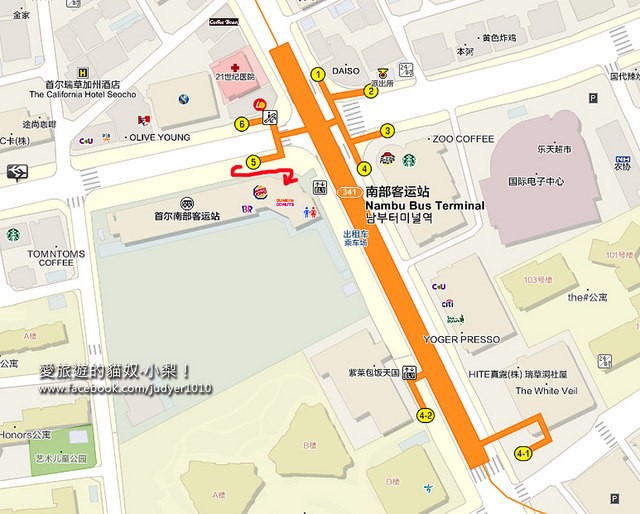 首爾南部客運站在地鐵3號線南部客運站(341)5號出口附近,按照紅色箭頭走就對了~
