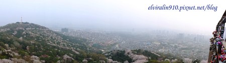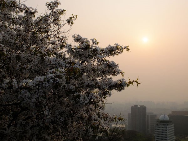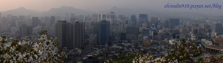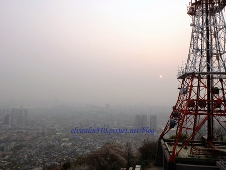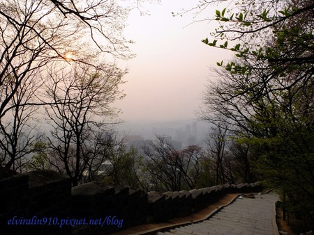 沿途有觀景台可以停下腳步休息,俯瞰首爾城市風貌,首爾的空氣污染很嚴重,總是灰濛濛的一片,旁邊的櫻花景色簇擁之下形成奇妙的對比。當天的日落時間是七點零五分,我五點半開始走,看著天空漸漸變成黃橙橙的顏色。