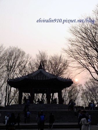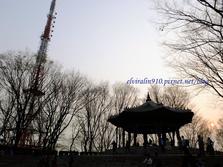 我發現韓國的觀光名勝景點,旁邊都會蓋有一座古韓式風味的涼亭,在現代高塔之旁,宣揚著韓國人引以為傲的歷史文化。至於旁邊的鐵塔,法國同學說幹嘛學我們家艾菲爾,日本朋友說幹嘛學我們家東京鐵塔,到底學誰不重要,在我心中那鐵塔就是不讓首爾塔看起來太孤單的配角罷了。
