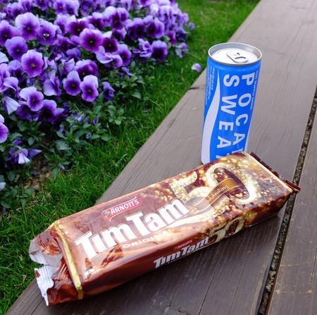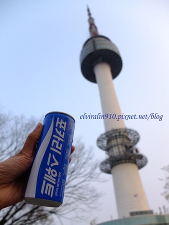 走累了當然要補水一下,投幣機投了個寶礦力水得,小小一瓶1000韓圓(台幣30圓),拿出準備好的補給Timtam巧克力,配上情侶的甜膩閃光、陸客俗又有力的拍照姿勢!南山塔我敬你!乾杯!
