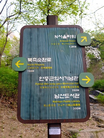 這次是我第三次去南山塔,第一次完全觀光客心態,搭纜車來回、灑大錢登上南山塔,自以為是地站在首爾的最頂端,還記得那天是西洋情人節的前夕,我的心莫名空的很。第二次,扮演起了國際學生的嚮導,帶著法國、摩洛哥、波蘭人上南山去,不料當天氣候不佳,連夕陽都看不到,波蘭人不自覺的喃喃抱怨著,呵呵...怪我囉?!那次充滿活力的歐洲人說「我們用走的下山吧!不遠!」真的不遠,沿途美景舒適到我暗暗下定決心,下次來南山我絕對不要給韓國政府賺纜車錢,我要坐11號公路,用我沒在運動的腳,爬!上!去!