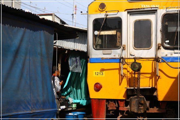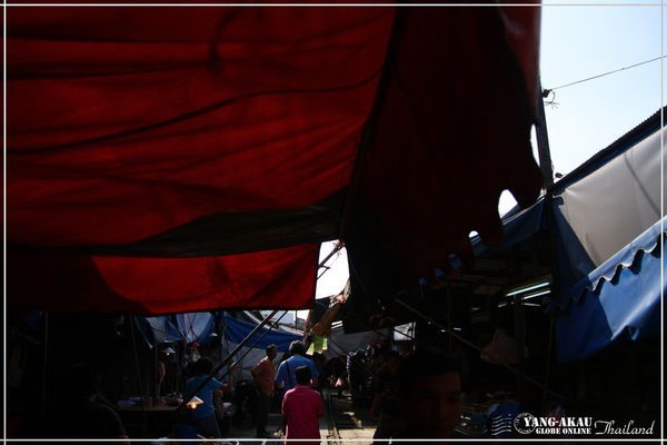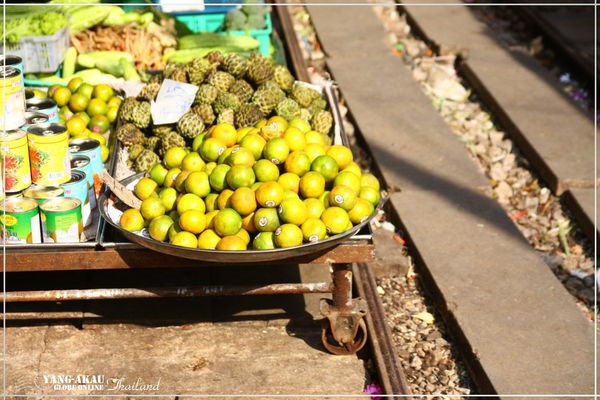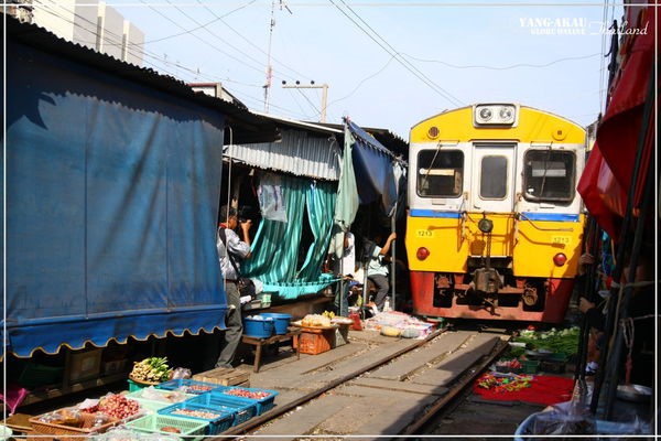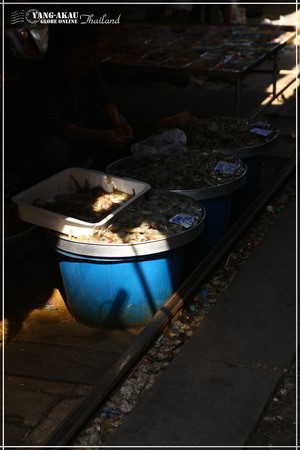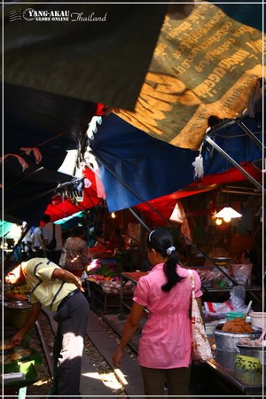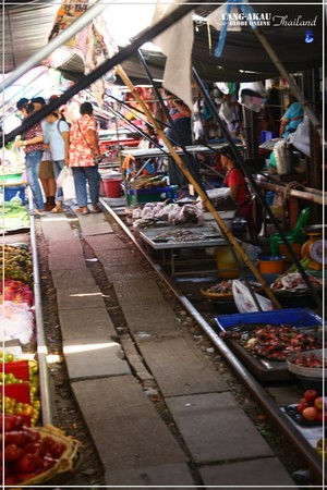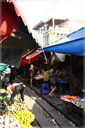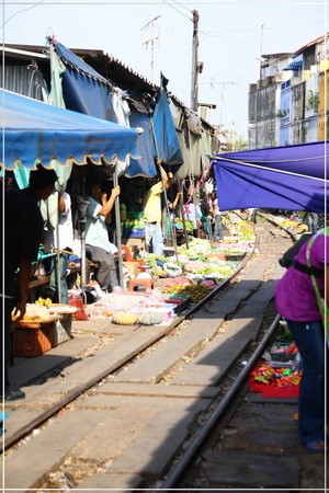 鐵道市場的入口,就在這個火車站前方。沿著鐵軌就能通往市集了。說真的,走在其中,還真的真一般泰國的市場沒有很大的差別,若不是特別知道等一下火車會從這邊經過,根本也不會特別注意到腳下踩的就是鐵軌啊XDDD~~