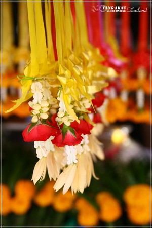 泰國人是愛花的民族,很多地方很多時候都會買花來裝飾。左邊這個我想應該是買來供奉神明的,我之前在曼谷有買過類似的。在這樣嘈雜的市集哩,一串串的花環吊在店家門外,路過的行人也都能一起呼吸到幾口芬芳。