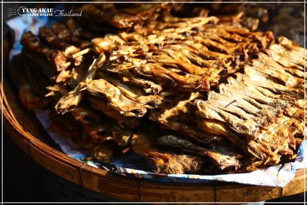 市場裡賣生鮮蔬果,也賣一些熟食,這熟食串成一串,成堆的擺在竹簍上煞是好看。不過看起來沒有很美味,也就沒有去嘗試了。而那一串串的分量很大,大概是一家子餐桌上一道菜的份量了吧....