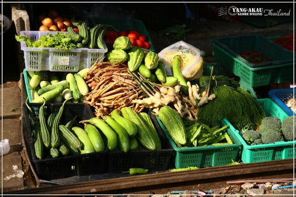一藍一藍的蔬菜,就這樣成堆疊在鐵道旁,並且緊臨著鐵軌。這讓我有種看好戲的感覺,也許等一下店家會手忙腳亂的匆匆收拾呢!