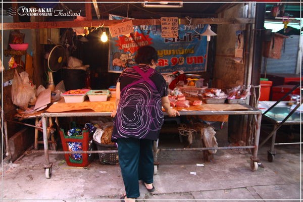 我們在市場裡晃了不短的一段時間,火車終於要進站囉。這食攤販們開始陸續收拾自家的攤為了,像照片裡這個肉販大嬸,料理台下還有滾輪耶,真是輕鬆啊~雙手用力一推進去就等於收好了,火車經過也不怕!