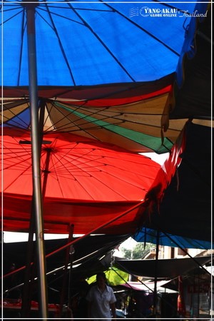 我的部落格友卡樂,有一次在他的文章裡說到了泰國人用的色彩很「迷幻」,我覺得這個形容詞是在是太妙又貼切了!我想應該是天性使然,就像是泰國街頭七彩的計程車一樣,泰國人很敢大膽的用許多不同的色彩,不管在何時何地,用色強烈的街景市場,總會提醒著旅人:「這裡是泰國喔,色彩繽紛的熱帶之國喔~」。像左圖那樣紅藍純色的大傘,在熱帶的陽光照耀之下,顏色還真是美麗!