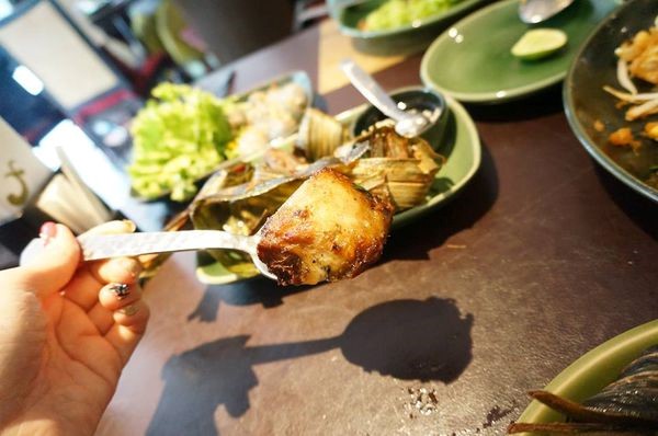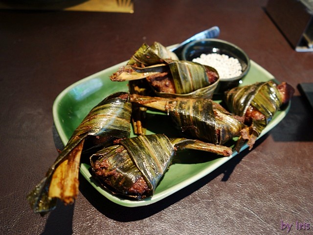 因為這雞肉是先包裹葉子再下去油炸 所以拿起來會有點油膩&燙手~