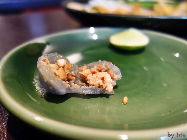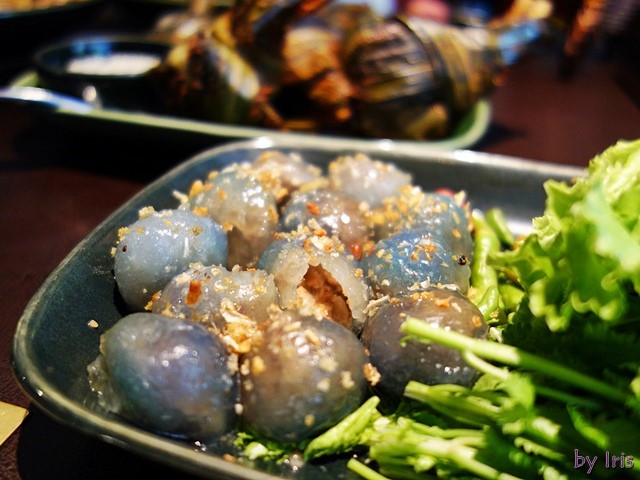 上頭灑著一些香酥的蒜酥 而外皮是用蝶豆花染的天然藍色~好特別又美麗!
