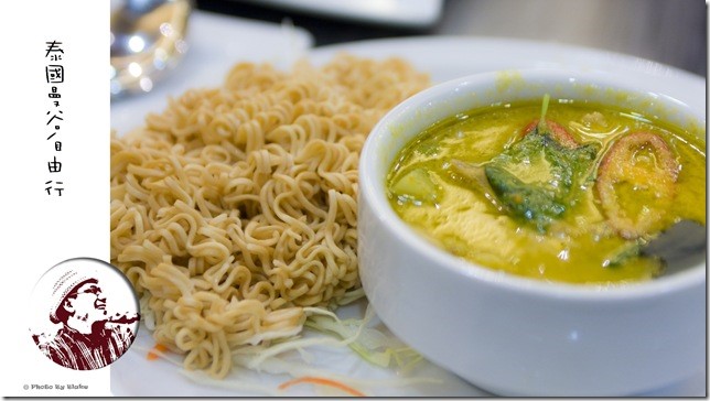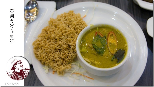 整包泡麵煮好乾放在旁邊,然後一碗綠咖哩雞可以用來沾麵