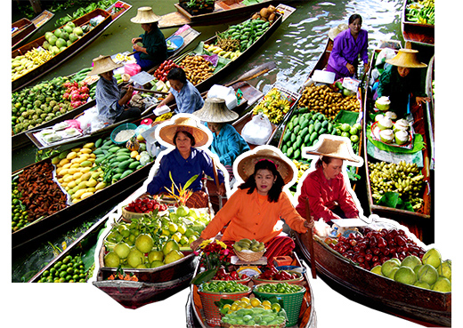 到處可見戴著斗笠婦女搖槳緩緩前進,錯落在綠色的運河上,這是最接近泰國人水上傳統生活型態的回顧;沿岸您可一路吃喝買玩、小吃、水果,四周商店上百家,您可慢慢挑選看看有無喜愛又物美價廉的寶貝。