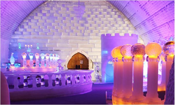 維持恆溫-7度的冰晶博物館,最著名的冰吧檯,可以坐在冰椅上品嚐一杯冰杯裝的青蘋果特調雞尾酒。還可以接觸用冰雕城堡、北極熊冰床,連頭頂的吊燈都是冰雕的,搭配上變換萬千的燈光,透過冰的光線真的超夢幻。