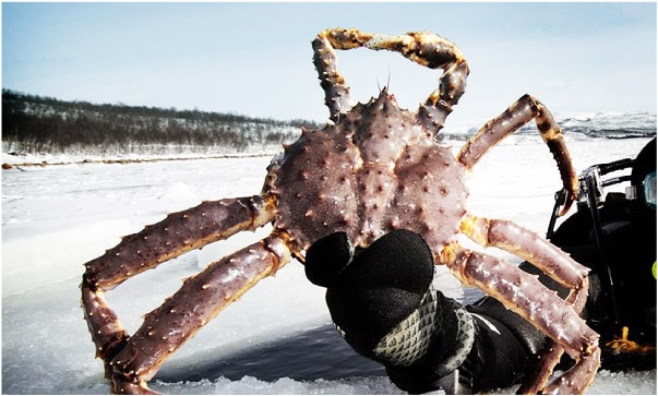 穿上專業禦寒衣物乘坐雪橇前往冰封海面,利用雪橇鑿出一個大洞,拉上預放的捕蟹籃,看看今天的漁獲~現撈的新鮮帝王蟹帶回海邊木屋烹調享用,一定要嚐嚐獨一無二的海鮮大餐!